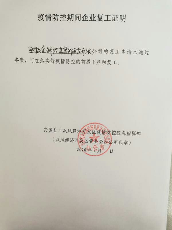 感謝您長(zhǎng)期以來(lái)對(duì)安徽金誠(chéng)公司的信任與支持。由于近期發(fā)生新型冠狀病毒感染的肺炎疫情,安徽省啟動(dòng)了重大突發(fā)公共衛(wèi)生事件一級(jí)響應(yīng)。為配合做好疫情防控工作,迅速安全的推動(dòng)恢復(fù)生產(chǎn),我公司有序組織,及時(shí)培訓(xùn),嚴(yán)格管理,充分準(zhǔn)備,接受監(jiān)管,向政府疫情防控企業(yè)復(fù)產(chǎn)復(fù)工指揮部提交了備案材料,經(jīng)政府相關(guān)部門(mén)現(xiàn)場(chǎng)核驗(yàn)后,獲得復(fù)工許可,并于2月12日正式復(fù)工。