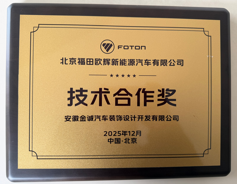 安徽金誠(chéng)汽車裝飾設(shè)計(jì)開(kāi)發(fā)有限公司獲得北汽福田客車技術(shù)合作獎(jiǎng)